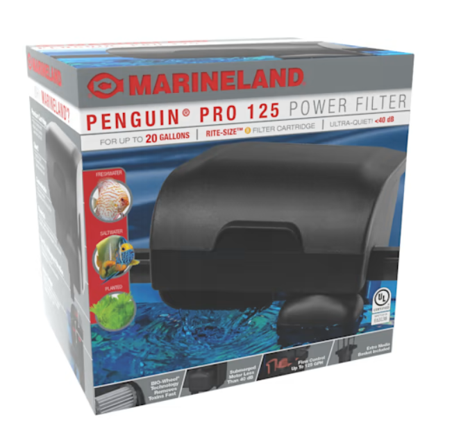 Marineland Penguin PRO Power Filter delivers easy, three-stage mechanical, chemical and biological aquarium filtration. This ultra-quiet filter has a decoupled motor to reduce noise so you can relax and enjoy your aquarium. This power filter contains BIO-Wheel technology to provide wet/dry biological filtration for nitrifying bacteria growth and eliminating toxic ammonia and nitrate fast. Uses Marineland Rite-Size B Filter Cartridge. Filters your six times per hour with flow control. Available in six sizes: 100 (for up to 10 gallons), 125 (for up to 20 gallons), 175 (for up to 30 gallons), 275 (for up to 50 gallons), 375 (for up to 75 gallons), 450 (for up to 90 gallons).