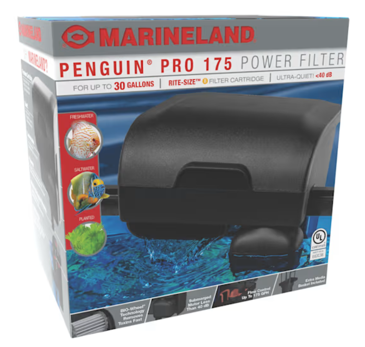Marineland Penguin PRO Power Filter delivers easy, three-stage mechanical, chemical and biological aquarium filtration. This ultra-quiet filter has a decoupled motor to reduce noise so you can relax and enjoy your aquarium. This power filter contains BIO-Wheel technology to provide wet/dry biological filtration for nitrifying bacteria growth and eliminating toxic ammonia and nitrate fast. Uses Marineland Rite-Size B Filter Cartridge. Filters your six times per hour with flow control. Available in six sizes: 100 (for up to 10 gallons), 125 (for up to 20 gallons), 175 (for up to 30 gallons), 275 (for up to 50 gallons), 375 (for up to 75 gallons), 450 (for up to 90 gallons).